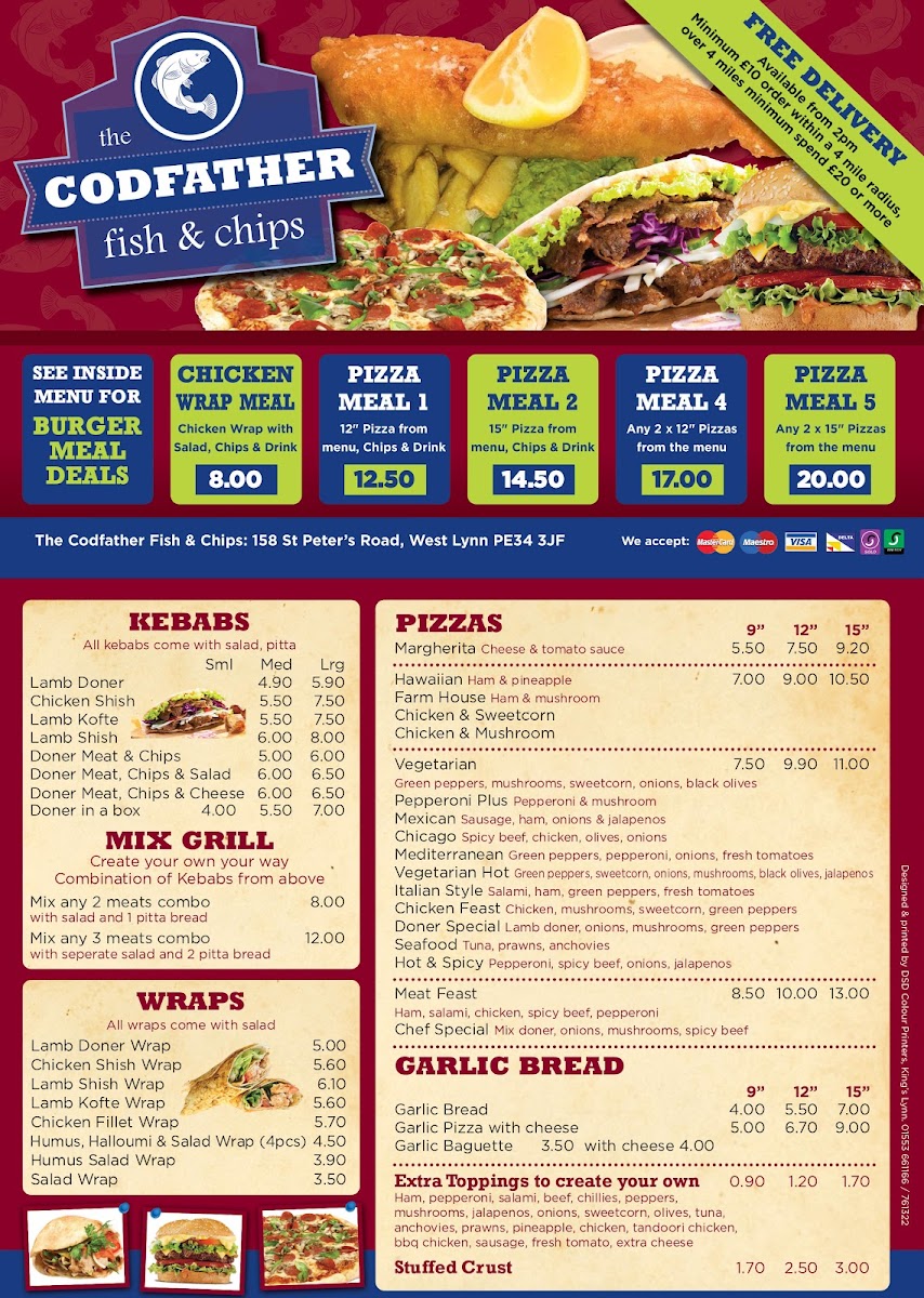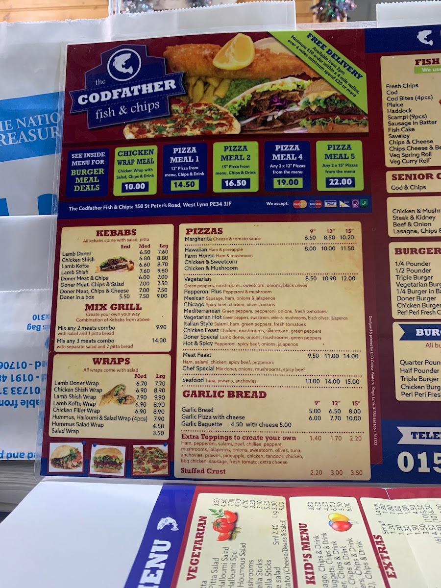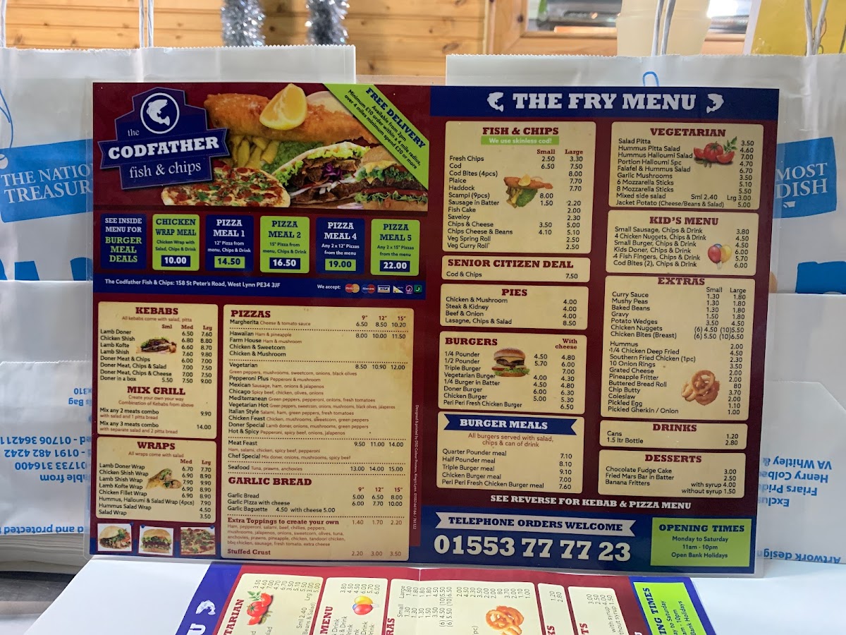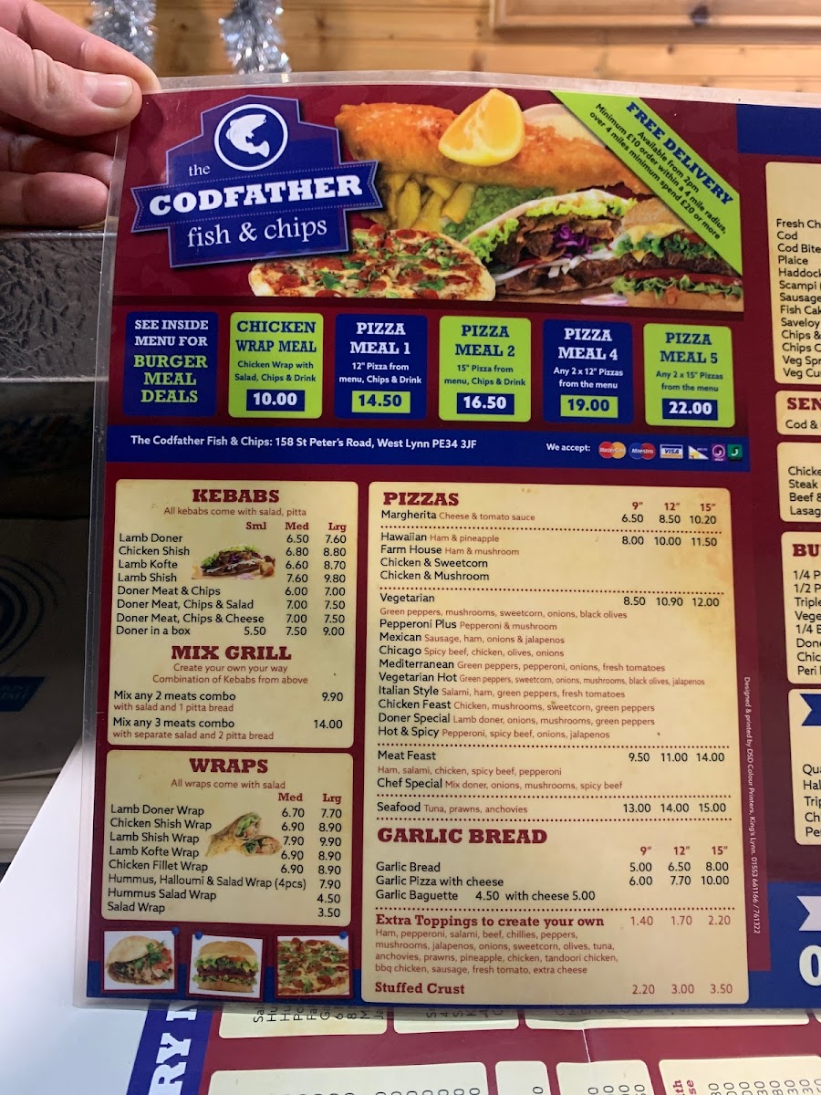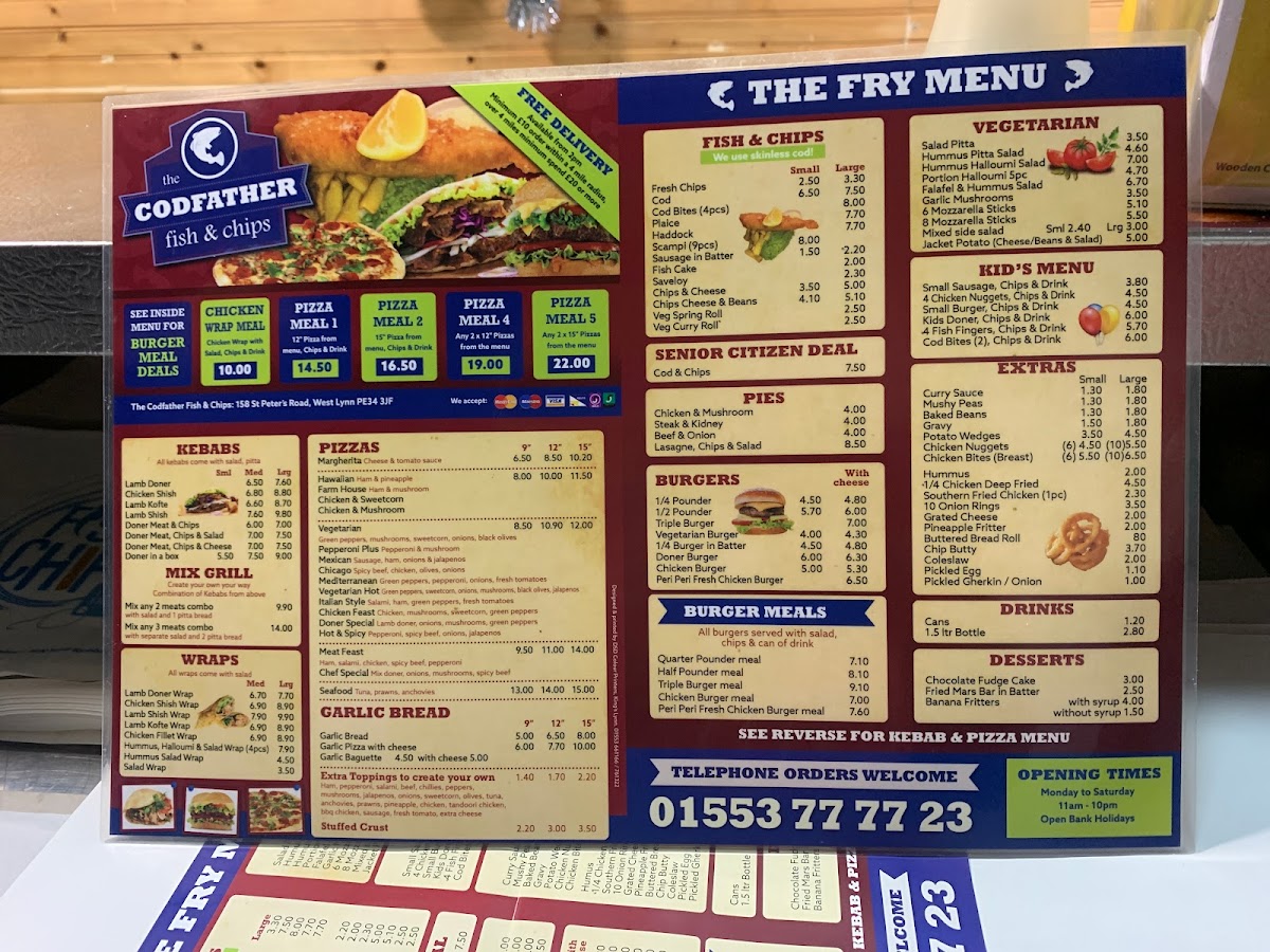 The Codfather Fish & Chips offers a broad menu featuring a variety of traditional and contemporary dishes. For fish lovers, the selection includes Cod and Haddock alongside Cod Bites, Plaice, and other favorites like Fresh Chips. The pie section includes comforting options such as Chicken & Mushroom and Steak & Kidney pies, while Lasagne and Chips & Salad are perfect for those seeking something different. Burger fans can choose from a range of options, including the classic 1/4 Pounder or 1/2 Pounder, or go for a Triple Burger or Vegetarian Burger. Meals like the Quarter Pounder Meal and Chicken Burger Meal add extra value. Vegetarians have plenty of choices, such as the Hummus & Halloumi Salad and Falafel & Hummus Salad, along with the option of Portion Halloumi (5pc). The kids' menu includes smaller portions, such as Small Sausage, 4 Chicken Nuggets, and Small Burger, all served with chips and a drink. For those craving something extra, Curry Sauce, Mushy Peas, and Gravy are great add-ons. The Kebabs section includes options like Lamb Doner and Chicken Shish, while the Mix Grill offers combinations of meats. Pizzas like Margherita, Hawaiian, and Farm House are also available, as well as Garlic Bread and Garlic Baguettes. For dessert, enjoy a sweet treat like Chocolate Fudge Cake or a Fried Mars Bar in Batter. The restaurant even caters to senior citizens with a special Cod & Chips deal. Whether you're in the mood for fish, burgers, wraps, or even a pizza, The Codfather has something for everyone at great prices.