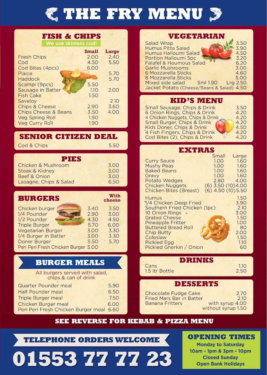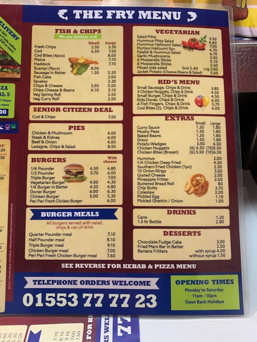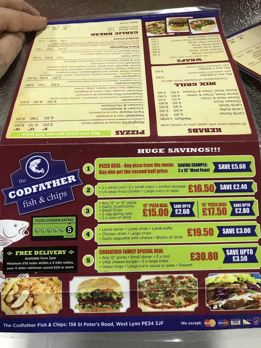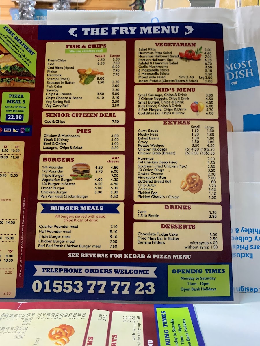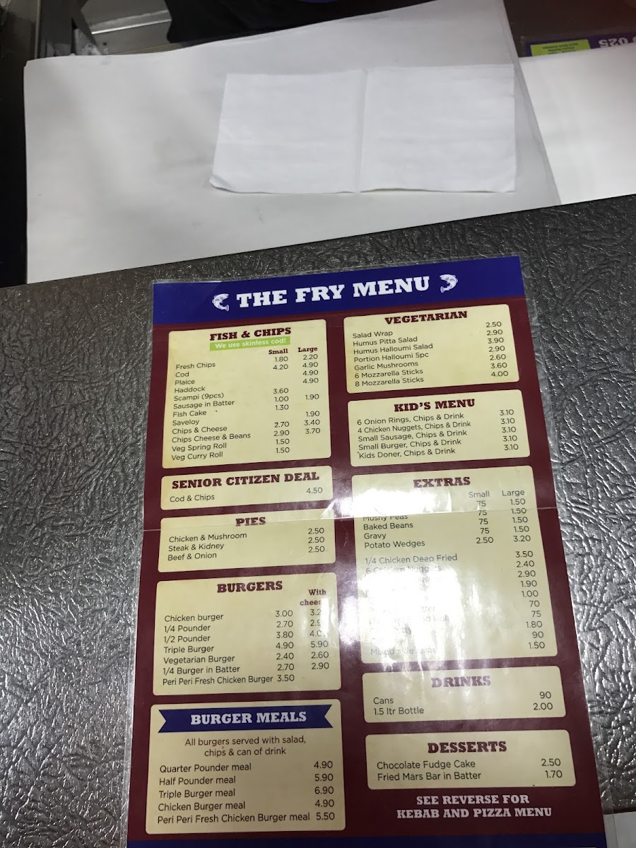 The Codfather Fish & Chips offers a broad menu featuring a variety of traditional and contemporary dishes. For fish lovers, the selection includes Cod and Haddock alongside Cod Bites, Plaice, and other favorites like Fresh Chips. The pie section includes comforting options such as Chicken & Mushroom and Steak & Kidney pies, while Lasagne and Chips & Salad are perfect for those seeking something different. Burger fans can choose from a range of options, including the classic 1/4 Pounder or 1/2 Pounder, or go for a Triple Burger or Vegetarian Burger. Meals like the Quarter Pounder Meal and Chicken Burger Meal add extra value. Vegetarians have plenty of choices, such as the Hummus & Halloumi Salad and Falafel & Hummus Salad, along with the option of Portion Halloumi (5pc). The kids' menu includes smaller portions, such as Small Sausage, 4 Chicken Nuggets, and Small Burger, all served with chips and a drink. For those craving something extra, Curry Sauce, Mushy Peas, and Gravy are great add-ons. The Kebabs section includes options like Lamb Doner and Chicken Shish, while the Mix Grill offers combinations of meats. Pizzas like Margherita, Hawaiian, and Farm House are also available, as well as Garlic Bread and Garlic Baguettes. For dessert, enjoy a sweet treat like Chocolate Fudge Cake or a Fried Mars Bar in Batter. The restaurant even caters to senior citizens with a special Cod & Chips deal. Whether you're in the mood for fish, burgers, wraps, or even a pizza, The Codfather has something for everyone at great prices.